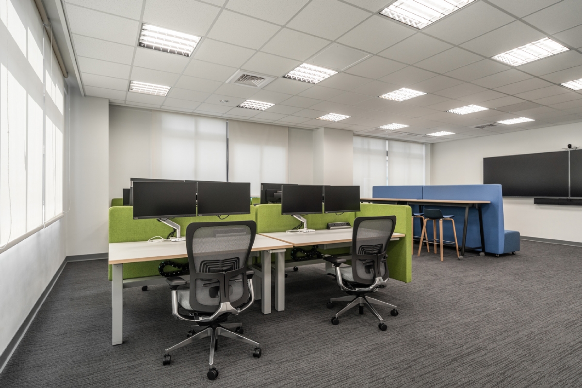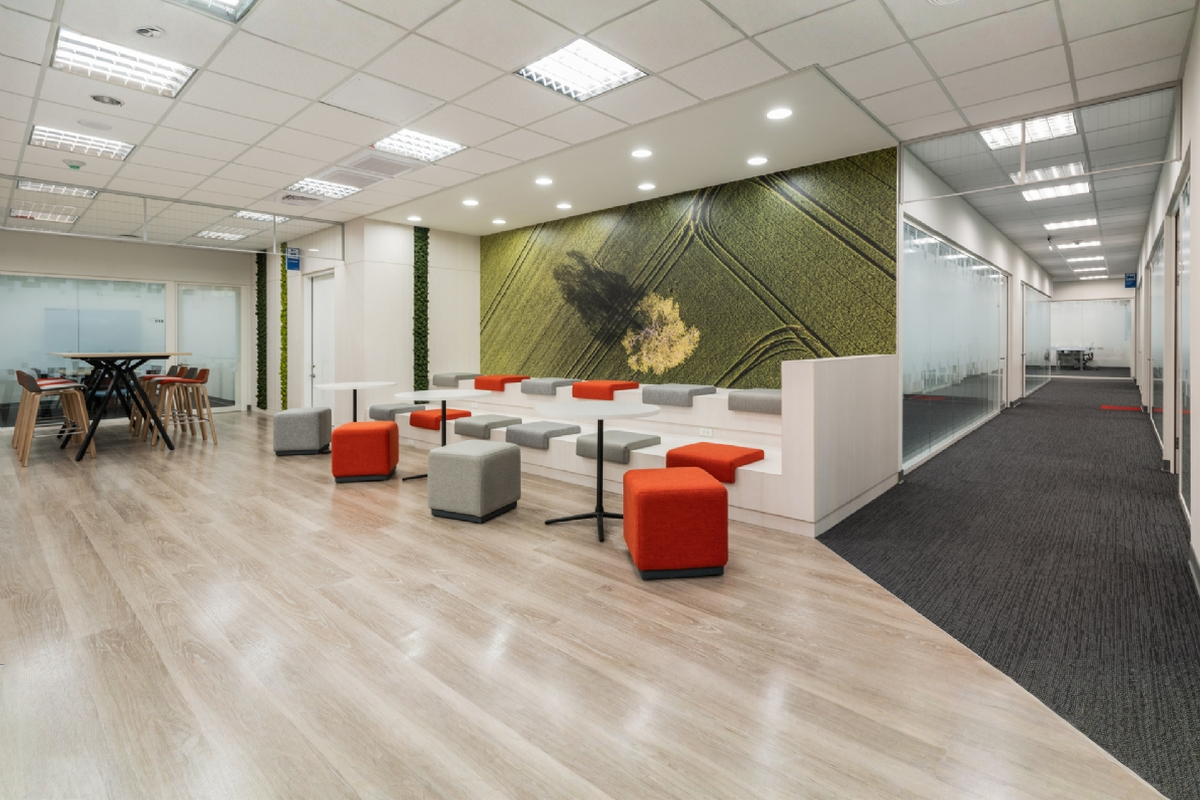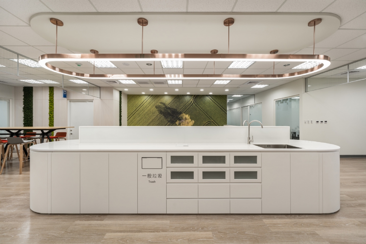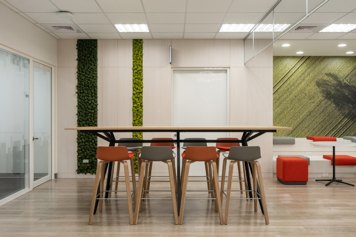 北歐風運用在室內設計裝潢上,強調簡約而實用的空間規劃,整體線條俐落,造型簡單,白色中島吧檯搭配流線燈飾展現現代感,而淺木紋地坪與木質家具則傳遞出北歐設計強調的自然溫潤氛圍。 牆面以綠植條狀點綴,結合灰白色調與局部橘紅色座椅,帶來活潑卻不失沉穩的氛圍,這種「自然材質 + 簡約色彩 + 溫潤木質」的搭配,正是北歐風的核心元素。卡座、長桌與吧檯等多元座位型態,則體現了當代辦公室設計強調的共享與交流精神,營造出既高效又舒適的工作與休憩場域。同時會運用植栽、軟裝織品及簡約藝術品作為點綴,使空間在理性中帶有柔和的生活感。 整體來說,北歐風在裝潢上的應用,展現的是自然、簡潔、溫暖且貼近生活的設計風格。